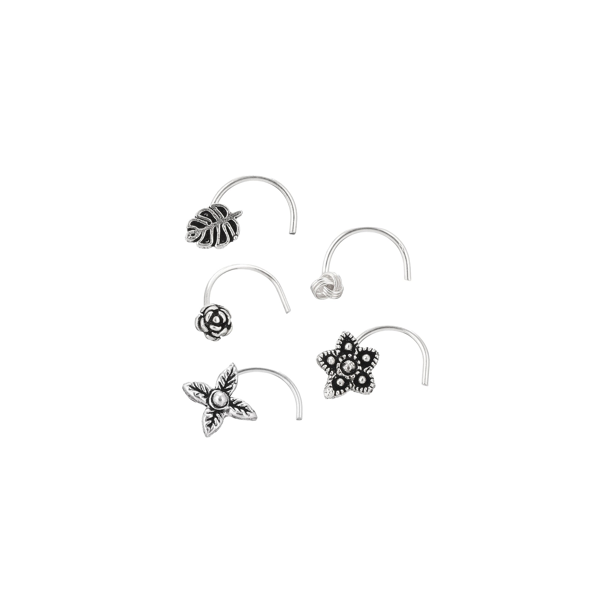 This 5-piece nosepin set made in oxidised silver is all about effortless beauty. With minimalist floral designs in 925 silver, these nosepins have a comfortable wire-style back for quick and easy wear. The perfect blend of daily wear practicality and timeless sophistication.
