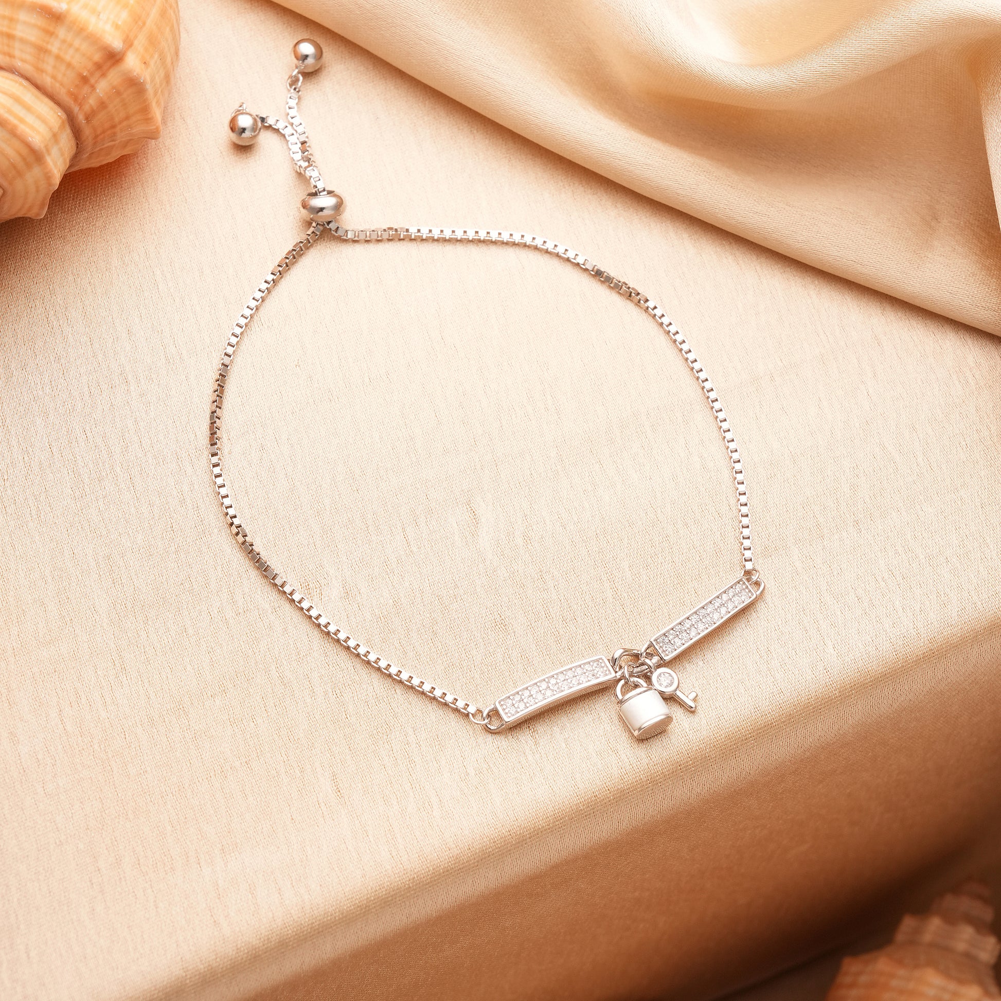 Designed in 925 sterling silver, this lock and key charm bracelet carries the message of love and trust. An adjustable, shiny high-quality CZ studded piece that is a perfect romantic gift for anniversaries, birthdays or date nights. Stack it, style it everyday!